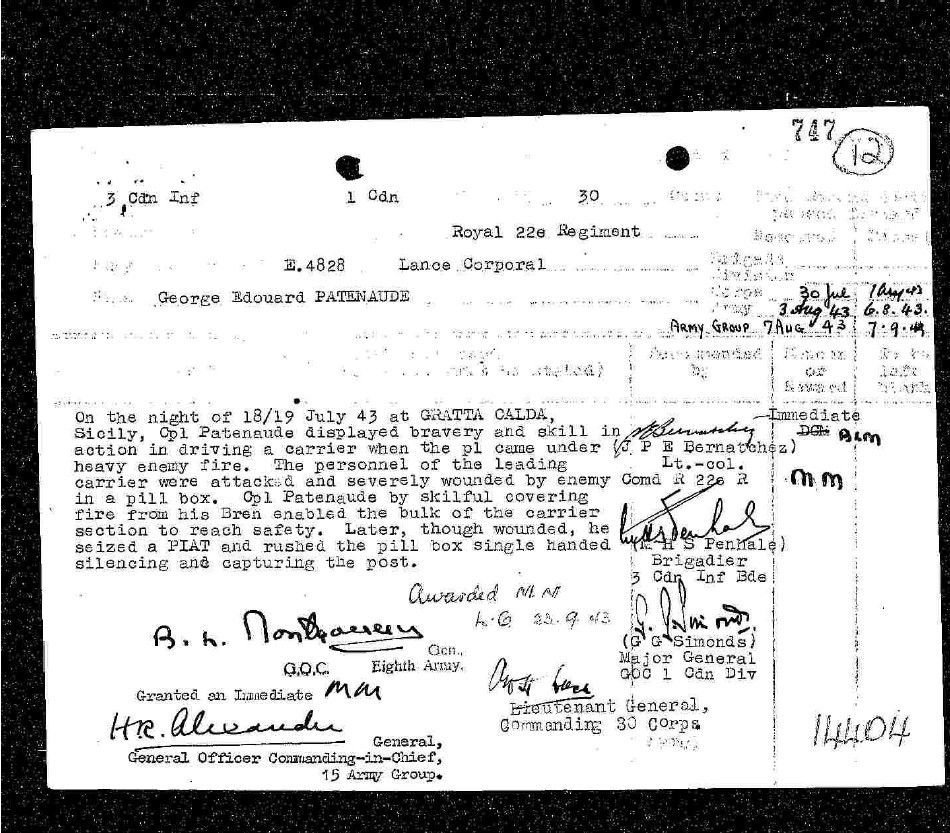 "On the night of 18/19 July 1943 at Grottacalda, Sicily, Cpl Patenaude displayed bravery and skill in action in driving a carrier when the platoon came under heavy enemy fire. The personnel of the leading carrier were attacked and severely wounded by enemy in a pill box. Cpl Patenaude by skilful covering fire from his Bren enabled the bulk of the carrier section to reach safety. Later, though wounded, he seized a PIAT and rushed the pill box single handed silencing and capturing the post."