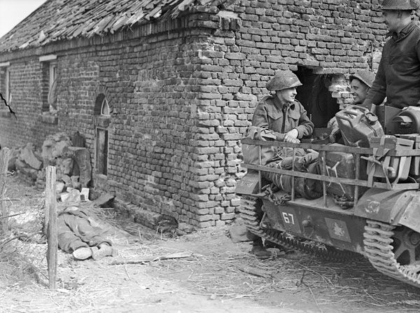 "The battle continued well on into the morning. Houses had to be cleared at the point of the bayonet and single Germans made suicidal attempts to break up our attacks. "Wasp" flame throwers were used to good effect. It was necessary to push right through the town and drive the enemy out into fields where they could be dealt with. "D" Coy sent a strong patrol out of the town and captured several MG crews who were asleep at their guns. What they had been through in the past 24 hours of almost continual attack had apparently rendered them completely exhausted.