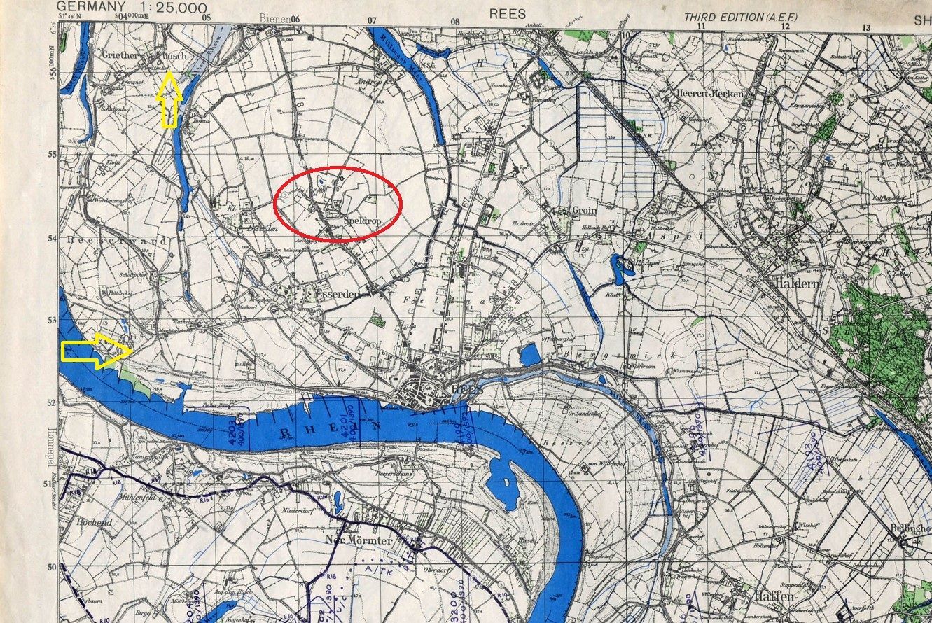 "Our order to move came through at 0345 hrs and at 0425 the four rifle companies loaded onto Buffaloes and crossed the "mighty" Rhine. The first Canadian unit crossing was made under sporadic shelling. At 0545 hrs the Command Group and "F" Echelon crossed and landed at MR 026535 (Reeserward). Our guides led us to our assembly area at 044565 (Grietherbusch). On the way to their coy area, "C" Coy picked up 30 Volksturm who were sitting along the dyke. Using their 1913 style rifles apparently did not apeal to the Volksturm and they were pleased when "C" Coy accommodated them and sent them along to the PW cage.