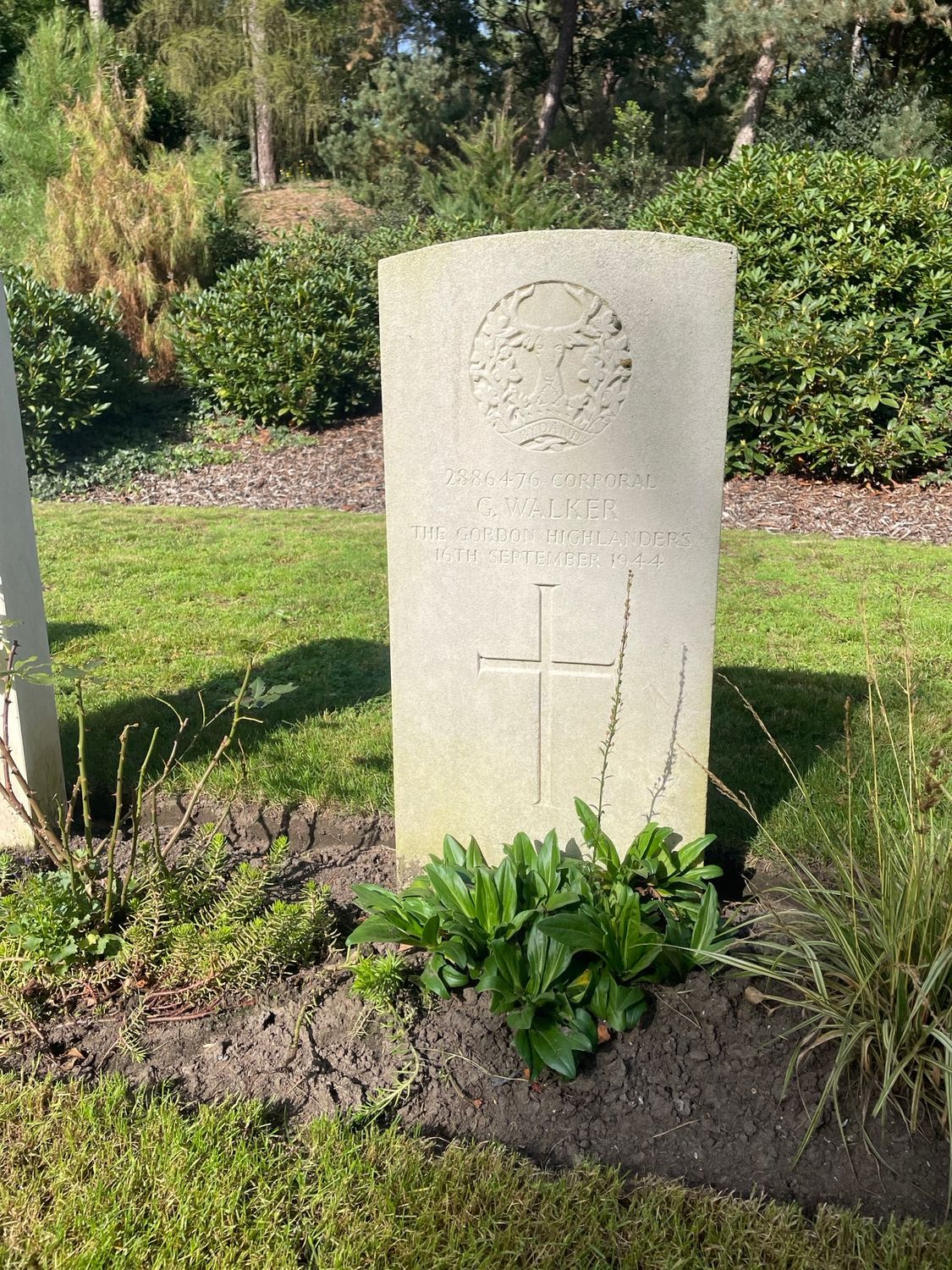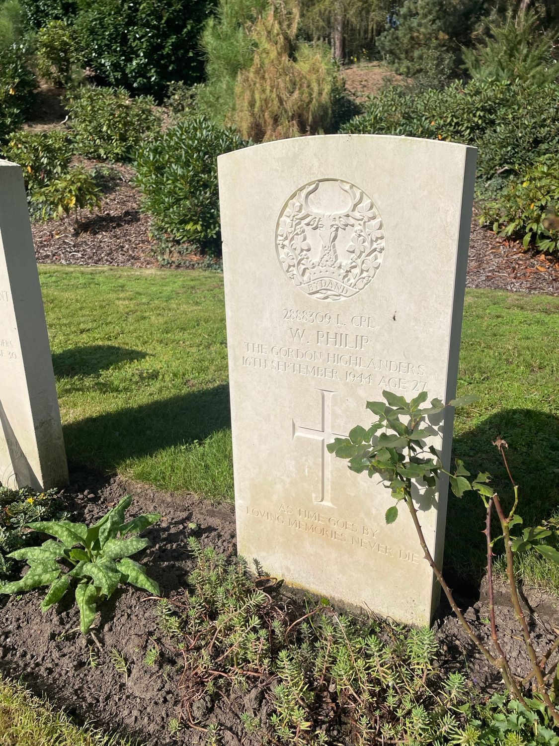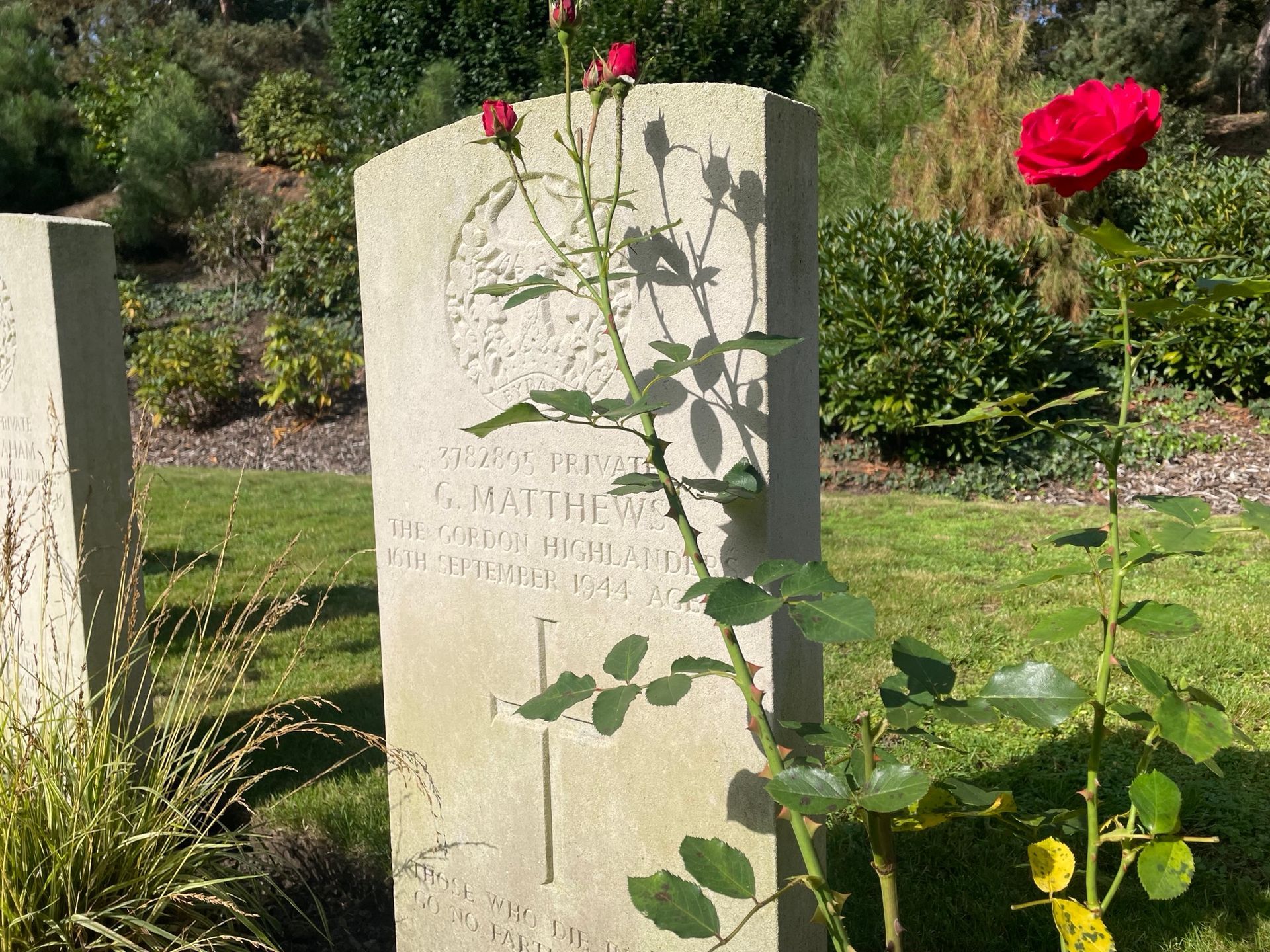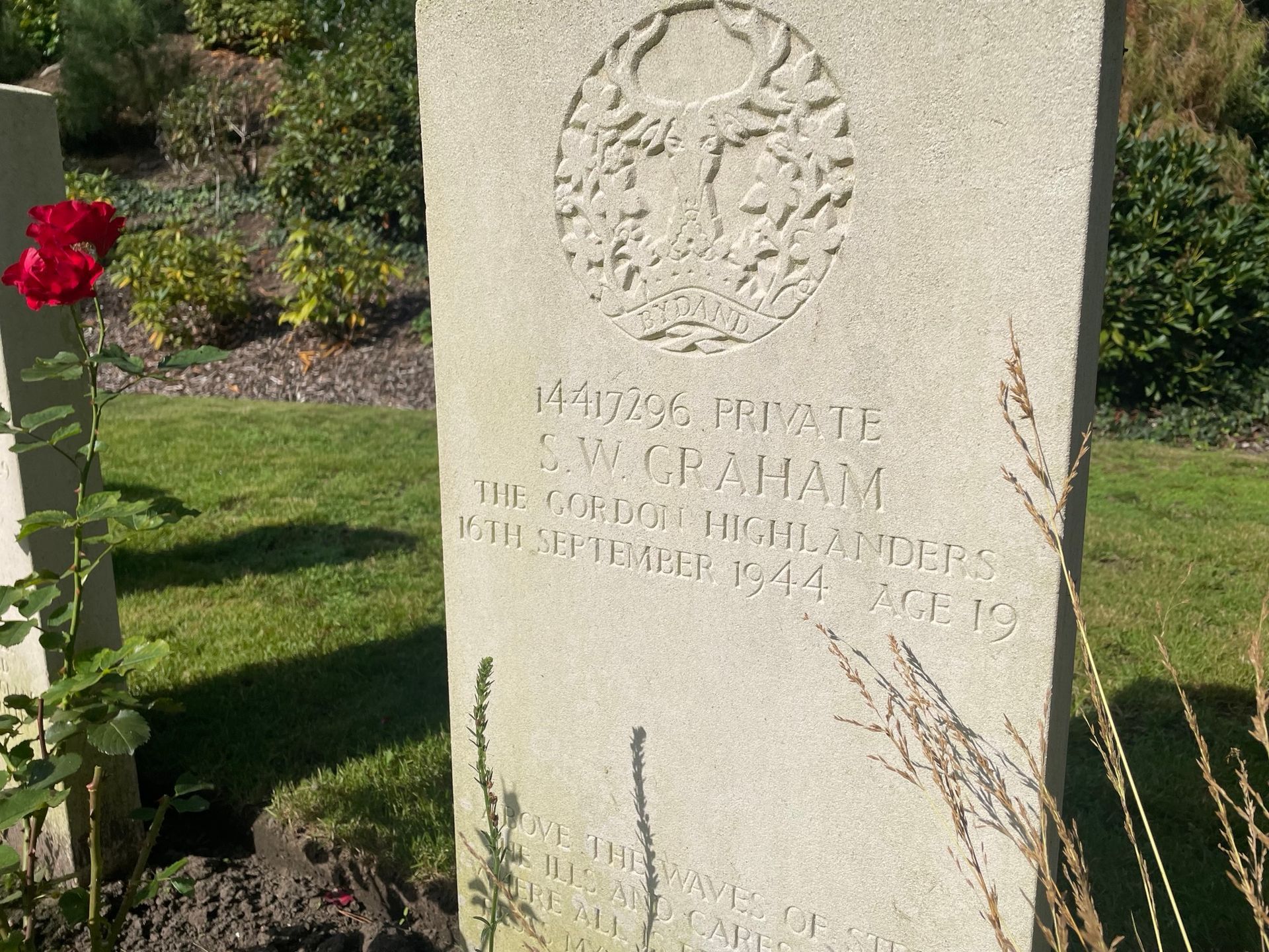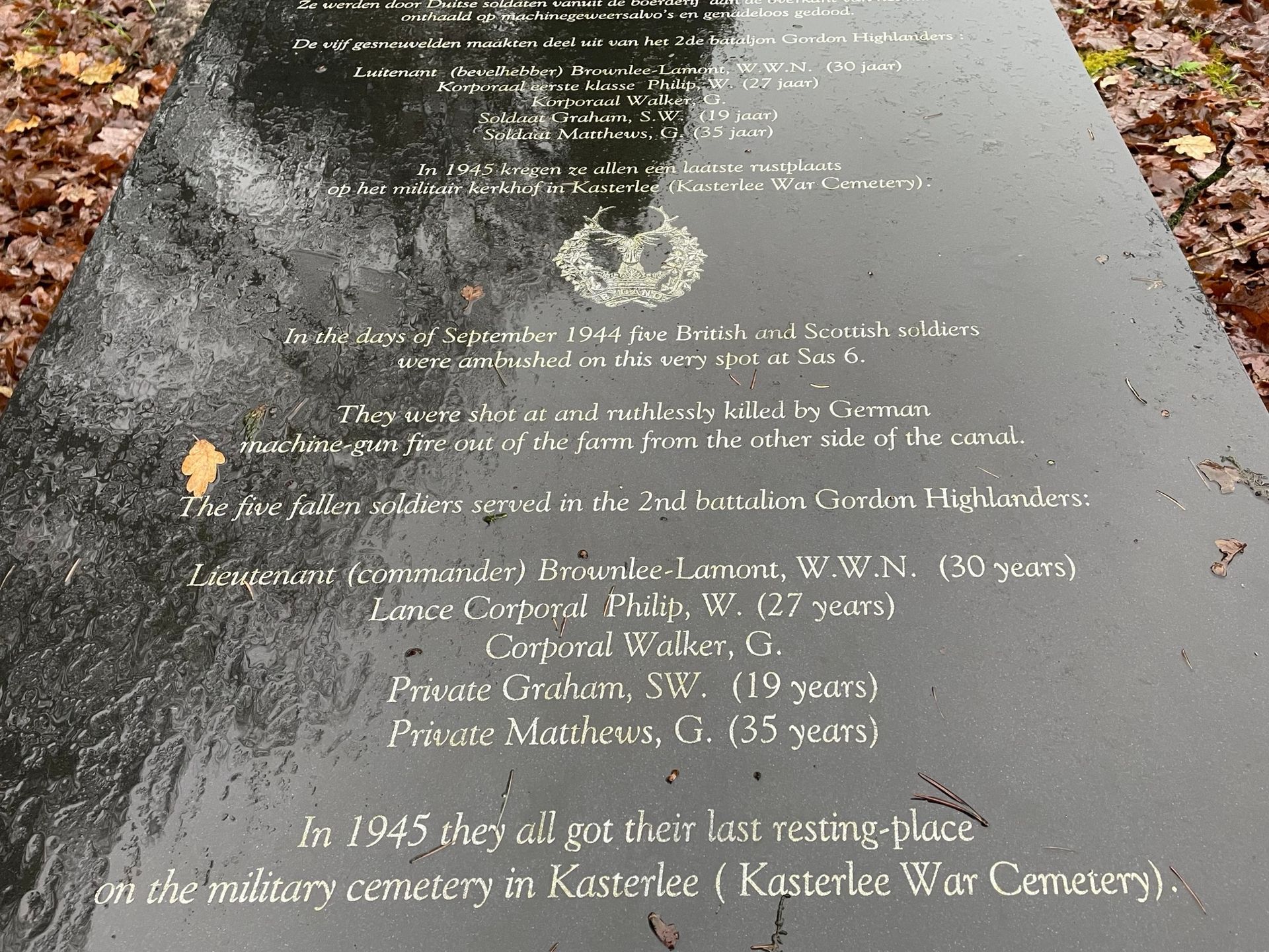 Walking the cemetery, you will find only a few Maple Leafs on the headstones. And although Brownlee-Lamont is the only one in the row with a Maple Leaf on his headstone, the lieutenant is not a stranger to the men surrounding him. He is accompanied by two men he knew on each side. Where the Canadians have a Maple Leaf, the British men have their unit insignia engraved on their headstones. All four men have the specific ‘Highlanders’ deer on their headstones, in this case that of the 2nd Battalion Gordon Highlanders. The unit Lt. Brownlee-Lamont was an officer in.